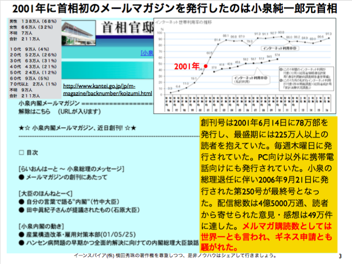 皆さんは通販サイトやファンクラブでメルマガを受信する機会が多々存在すると思いますが、小泉元首相もメルマガを配信していた頃がありました。(2001年)