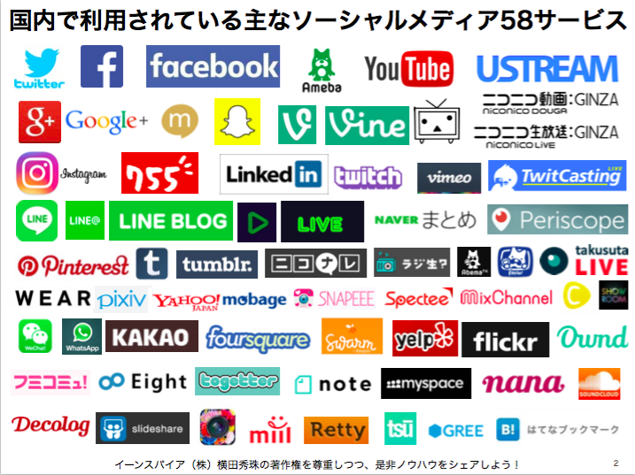 現在日本国内で利用されているソーシャルメディアをざっと挙げてみてもこれだけの数が存在します。