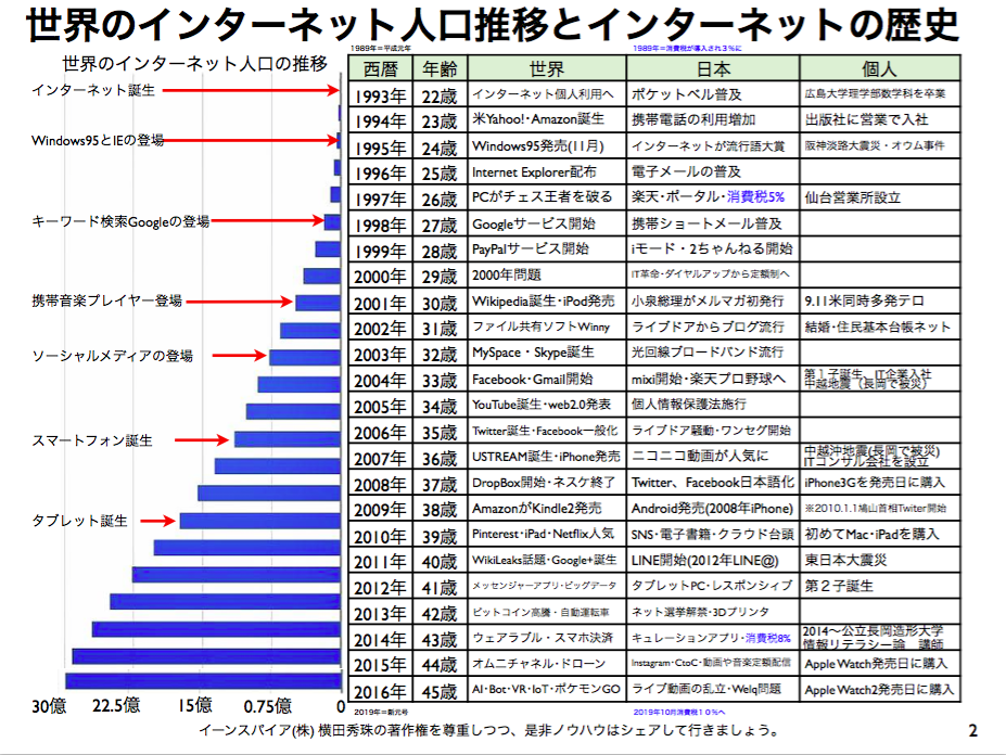 まず、世界のインターネット人口推移とインターネットの歴史について。